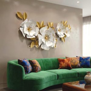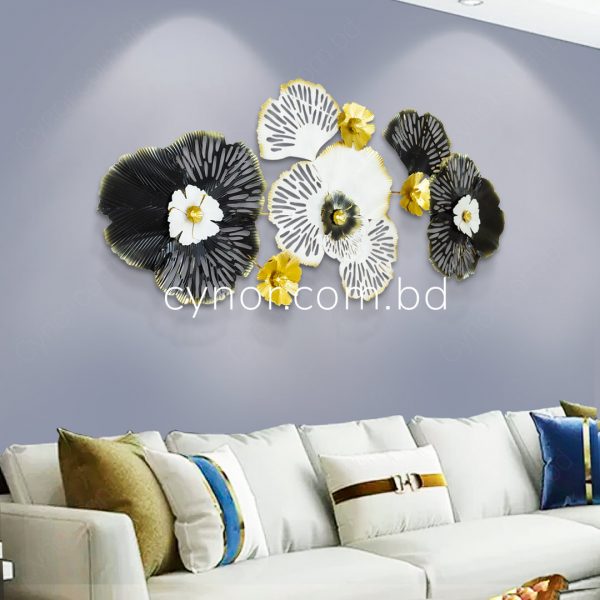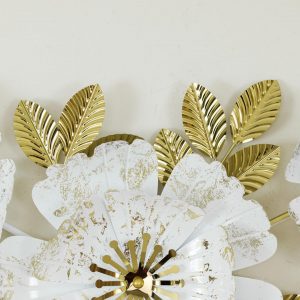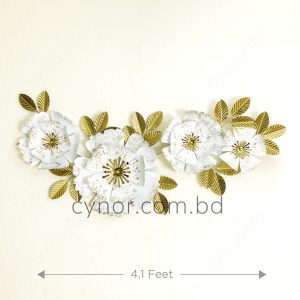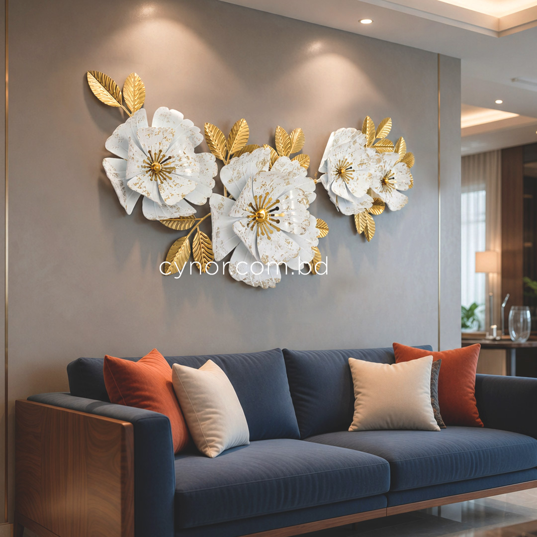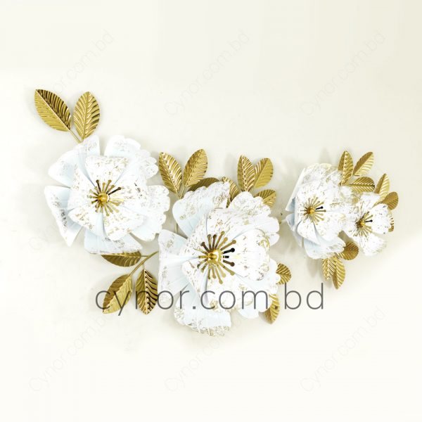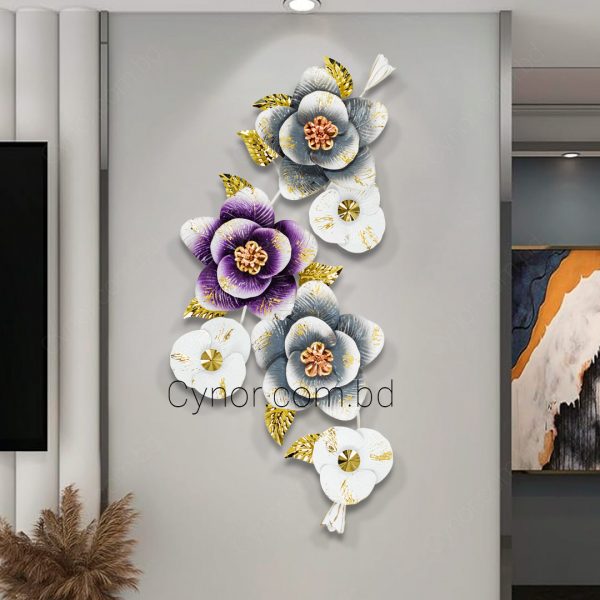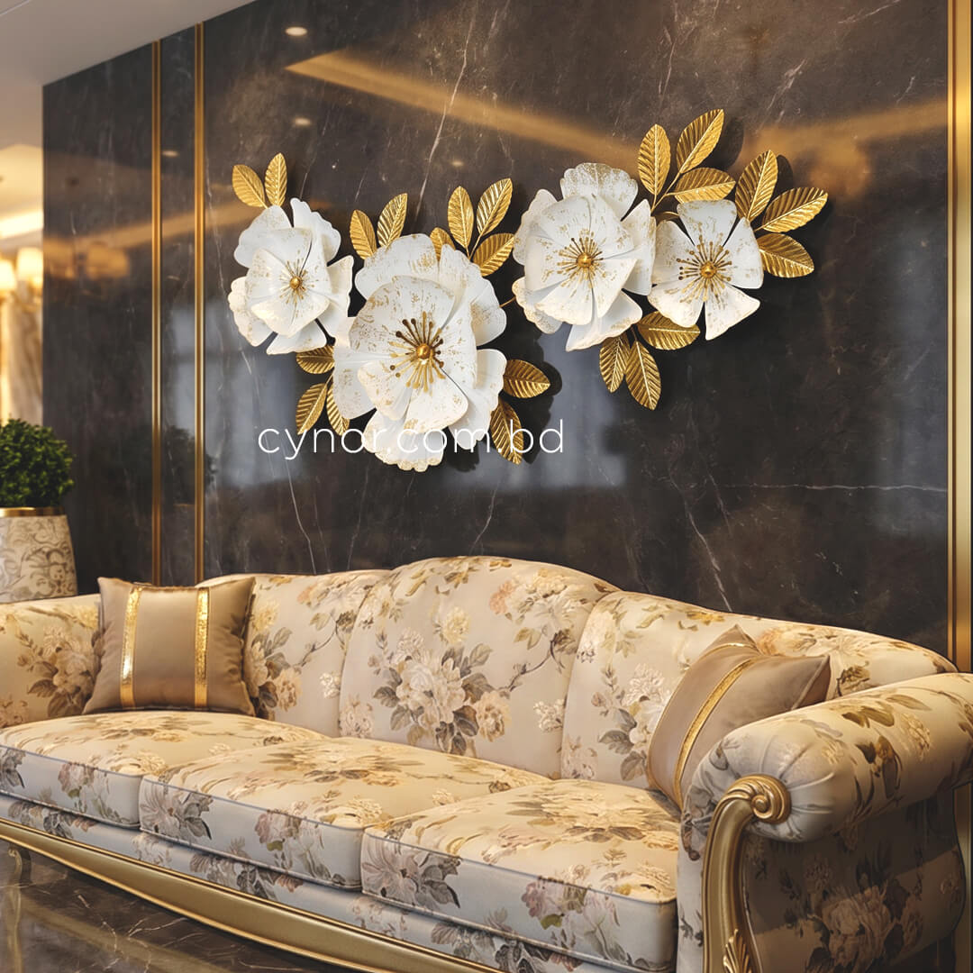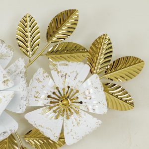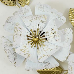 Features an elegant arrangement of layered metal flowers and leaves, creating a rich botanical statement for feature walls.